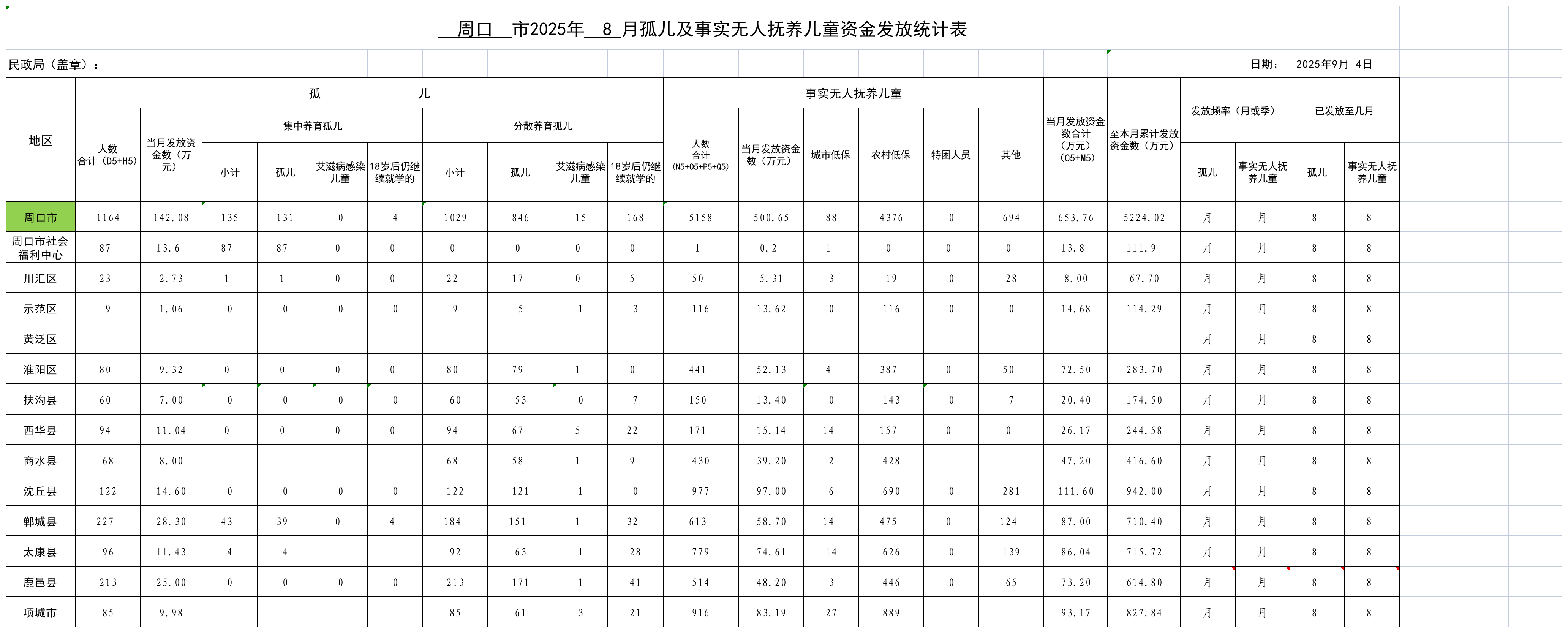 周口市8月份孤儿及事实无人抚养儿童资金发放统计表