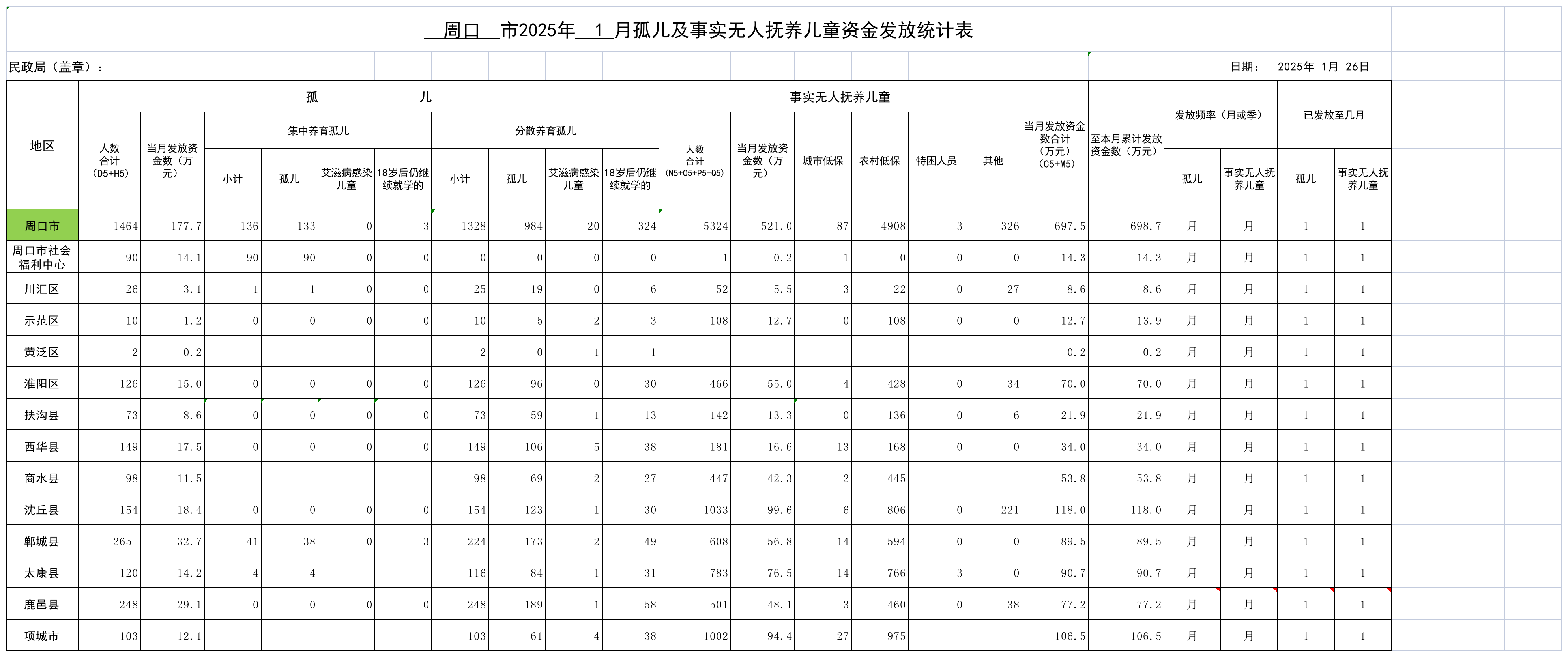 周口市1月份孤儿及事实无人抚养儿童资金发放统计表