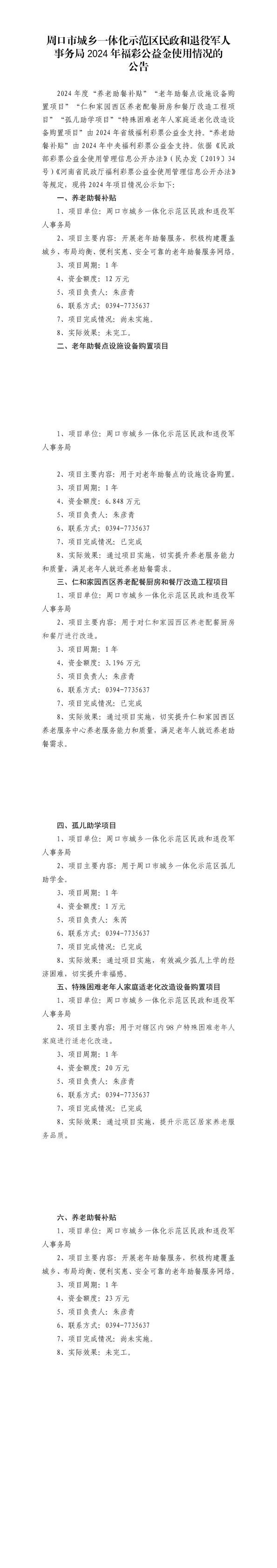 周口市城乡一体化示范区民政和退役军人事务局2024年福彩公益金使用情况的公告
